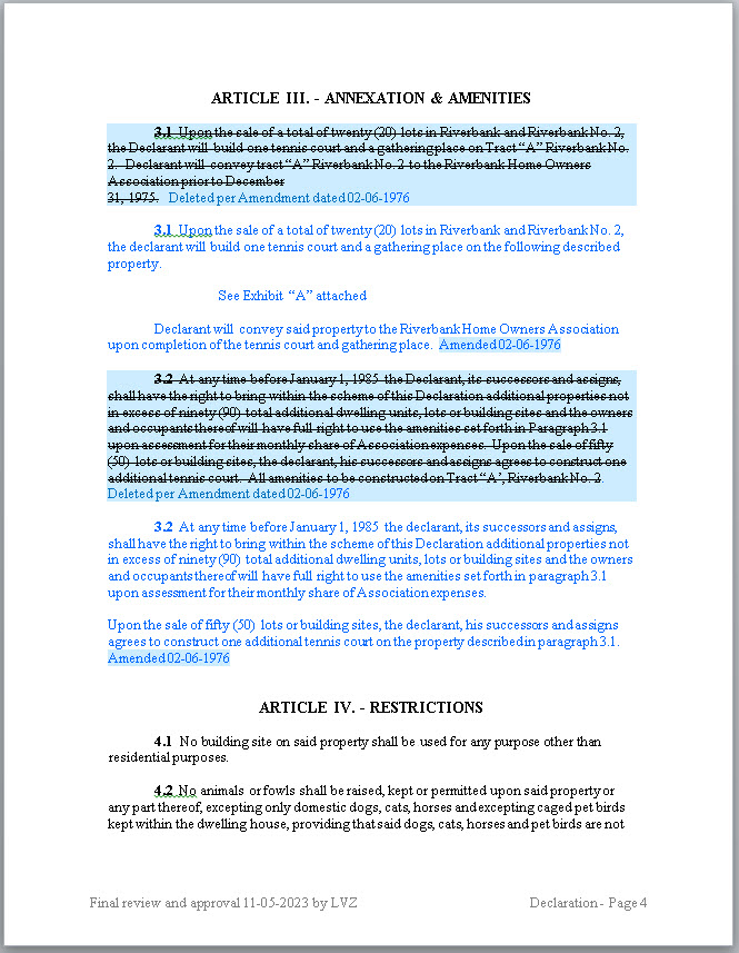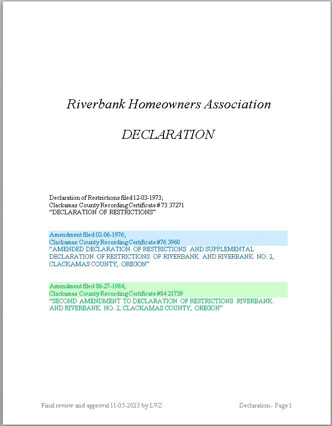- BLUE: Blue ink and highlights are from the first amendment to the Declaration filed with the County on 02-06-1976.