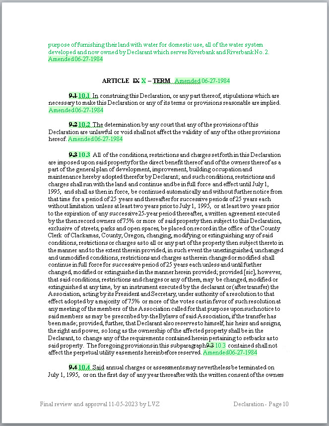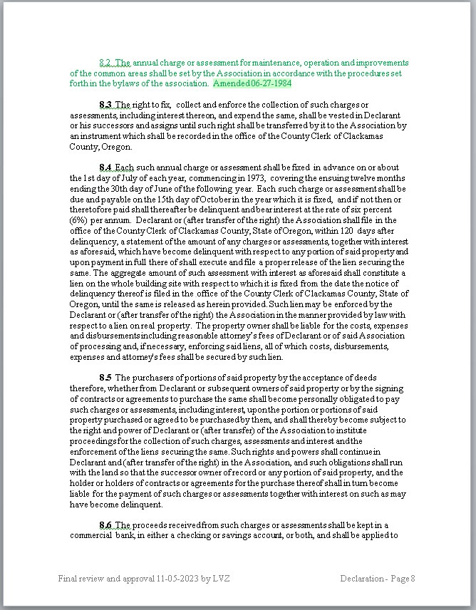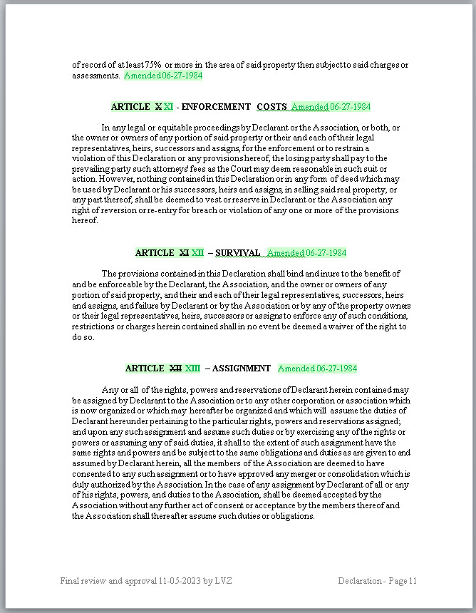 - GREEN: Green ink and highlights are from the second amendment to the Declaration filed with the County on 06-27-1984.