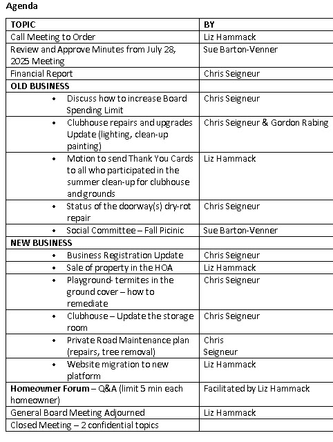 The Riverbank HOA Board is meeting at the Riverbank HOA Clubhouse on October 8, 2025, at 6:30pm. We have 3 more Regular Board Meetings this fiscal year and then the Annual Meeting in May 2026. During the Annual Meeting you will elect a new Board to replace 3 of the Board members with expiring terms. We'd like to use these 3 Board meetings as an opportunity for HOA Members to observe the Board meetings so they can decide if this volunteer leadership role is right for them. As a reminder, our By-Laws require 5 Board Members to run the HOA. If you are not able to attend the meeting, but want to explore Board Leadership, please contact any of your Board Members.