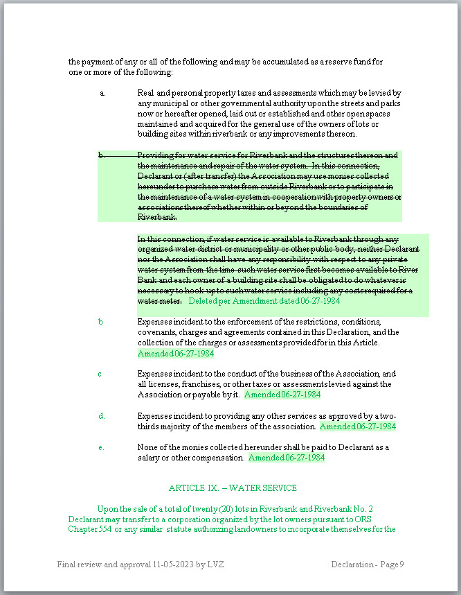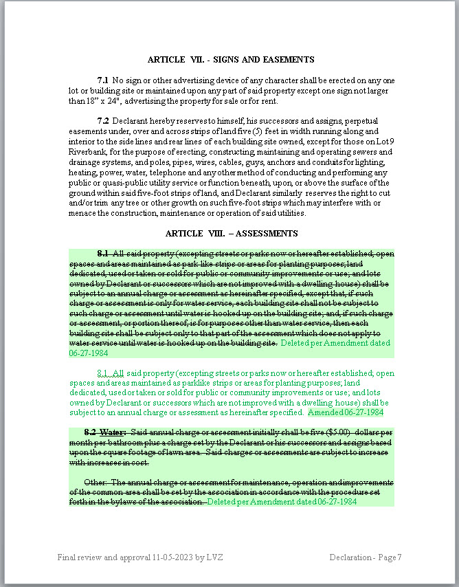 - GREEN: Green ink and highlights are from the second amendment to the Declaration filed with the County on 06-27-1984.